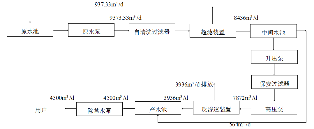 工艺流程:水污处理厂出水→原水泵→自清洗过滤器→超滤系统→中间水池→升压泵→(还原剂、阻垢剂加药)→保安过滤器→高压泵→反渗透装置→除盐水池→除盐水泵→用水点。