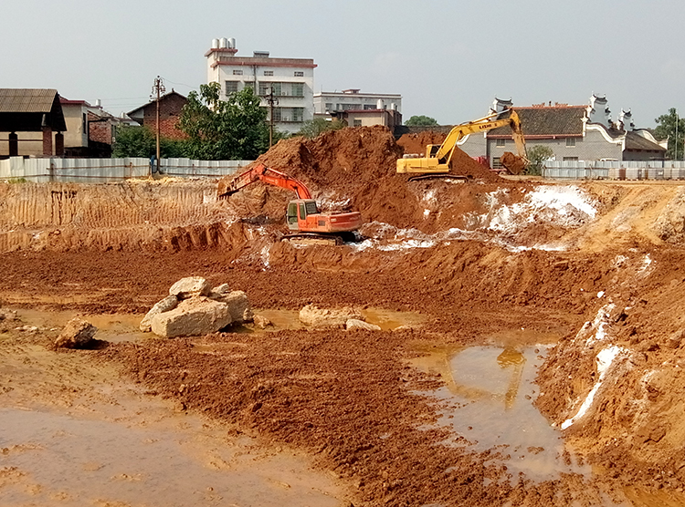 本项目对镉渣堆周边场地的污染土壤进行固化稳定化处置:沿河堤和周边池塘的土壤进行原位固化稳定化(深层搅拌桩工艺);中间地带的土壤原地挖掘固化稳定化然后进行回填。