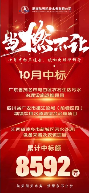 金秋十月,硕果累累。航天凯天环保水务公司传来喜讯,公司在激烈的市场竞争中连中三标,再创佳绩!这一辉煌成绩,不仅是公司实力的有力彰显,更是全体员工在“百日冲刺”行动中奋力拼搏的丰硕成果,充分展现了航天精神的时代风采。