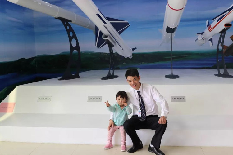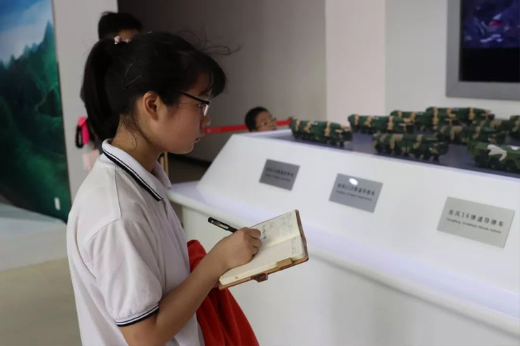 在企业文化展厅,小朋友们开心地与导弹合影,更有读中学的学霸姐姐,拿出笔记本认真记录讲解员解说的导弹知识。