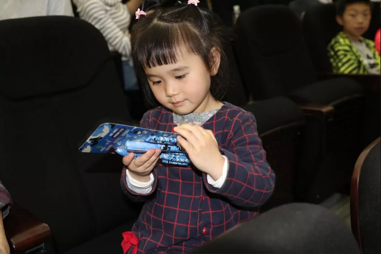 收到礼物“火箭笔”后,一名小朋友认真研究了一番